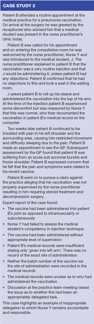 The RCN is clear in its guidance.6 Registered nurses have both a duty of care and a legal liability with regard to patients. If a registered nurse delegates a task they must ensure that the task has been appropriately delegated, meaning: