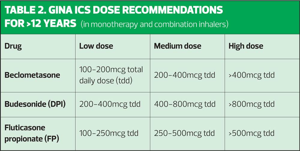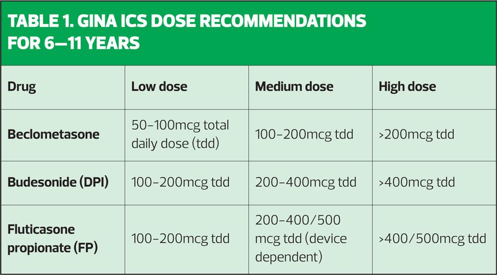 The doses in Table 1 (overleaf) are slightly different from those suggested by BTS/SIGN, mainly because they are not advising on dose equivalence but are suggesting pragmatic dosing for the products currently available. These are just examples and other ICS molecules are included in the table in the full guidelines (p45). GINA also states that high dose ICS should be used in children who are waking weekly with asthma symptoms. GINA guidelines state that dose adjustments, both up and down, can be made at around 2–3 months.