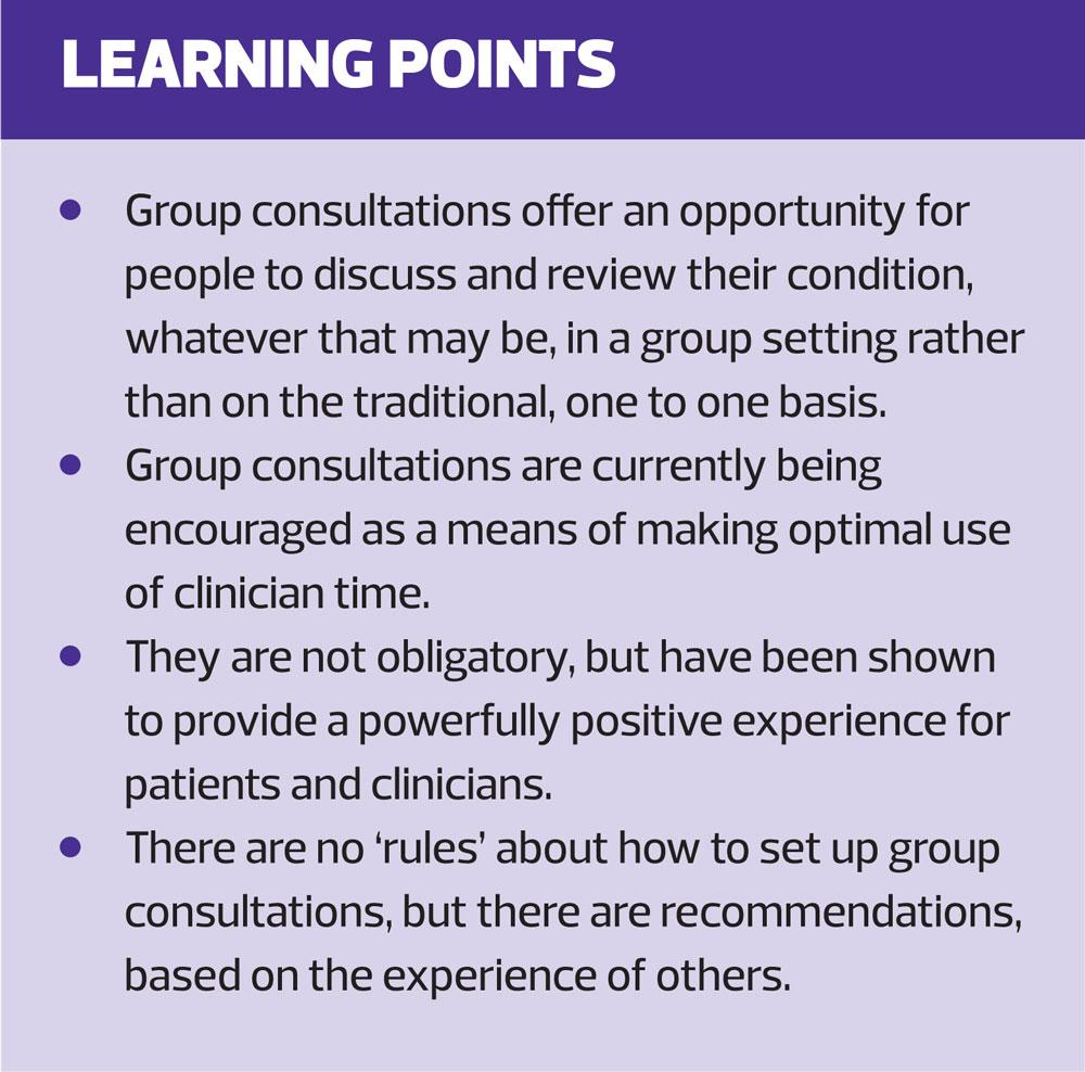 Group consultations, also known as shared medical appointments, are an alternative to the traditional one to one appointments. They are, instead, delivered by a general practitioner (GP), nurse or pharmacist, in partnership with a group of patients with similar health issues, in a supportive group setting. This approach is something the Government is encouraging clinicians to consider,1 and the feedback from patients who have attended group consultations (admittedly a self-selecting group) has been overwhelmingly positive.2
