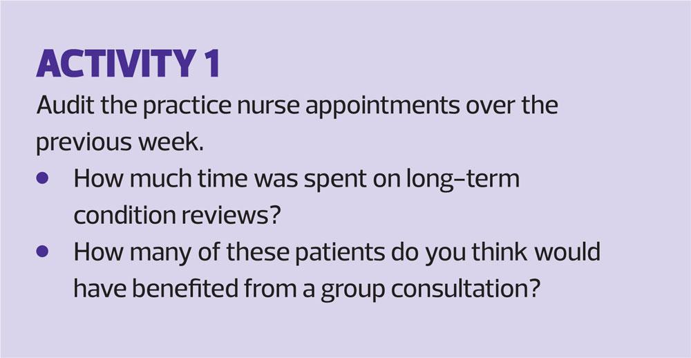 Group consultations can replace standard consultations, such as an annual review. They are not extra to them, so they do not add to the workload but should, in fact, help to streamline it. In group consultations the clinician can potentially see 10 or more patients in a 60-minute slot. Working this way can significantly impact on clinician capacity, whilst giving patients more time to discuss their feelings and concerns, thus creating the time and space for both patient and clinician to thrive.
