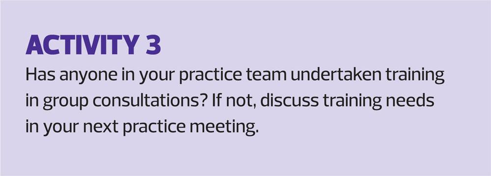 It has been said that one of the big mistakes that people carrying out group consultations make is not to have a facilitator. This individual not only helps with the initial part of the consultation, but also helps with time keeping, allowing the clinician to move on in a timely fashion. At the end of the session, and after the clinician has left, the facilitator can tie up any loose ends and carry out an evaluation of what went well, or less well, ready for the next time.