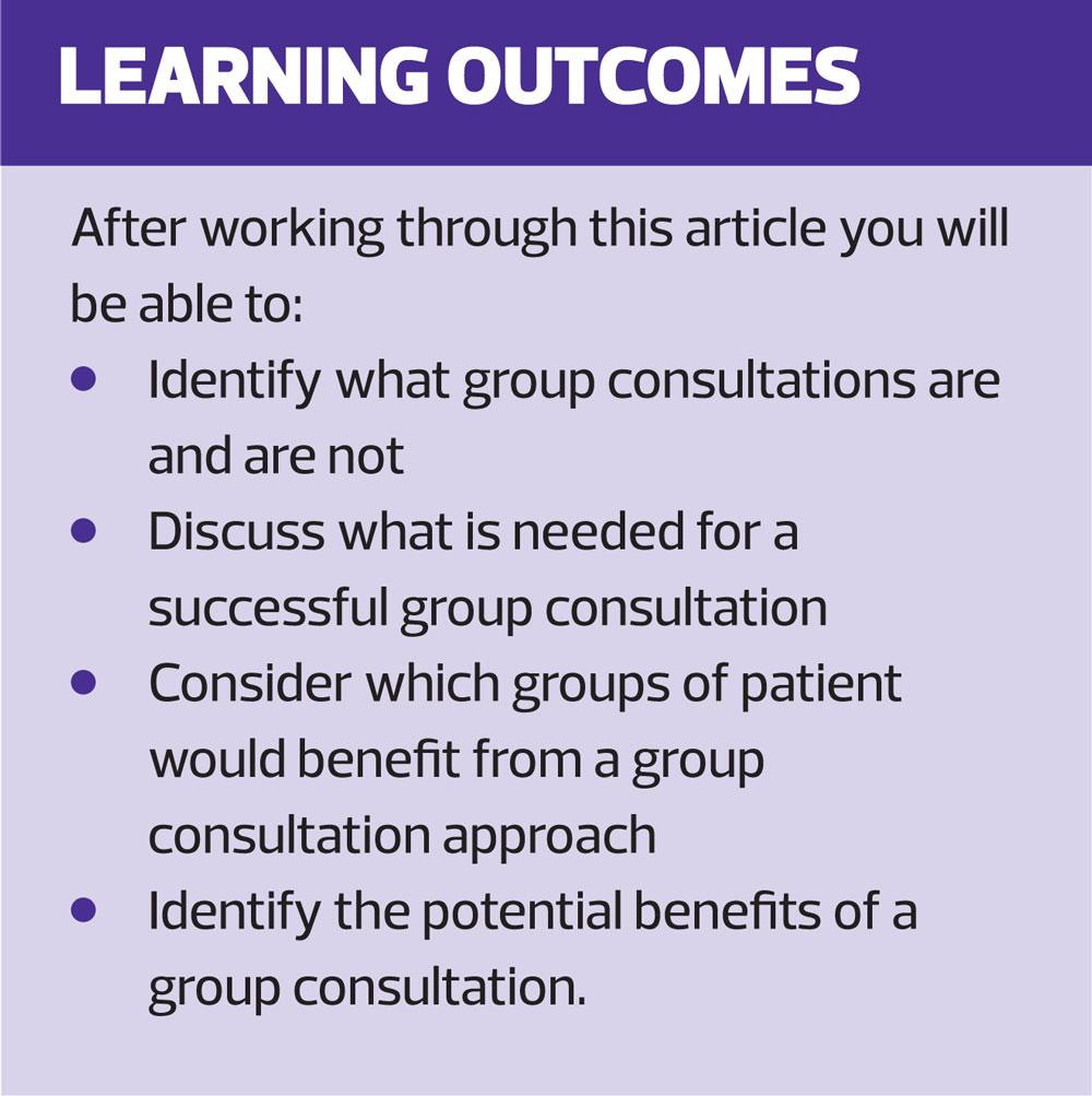 This article aims to clarify what a group consultation is, and is not. As well as discussing how they work and who should attend, it will consider their place in primary care and share some personal experiences of setting up CGs in practice.
