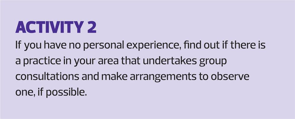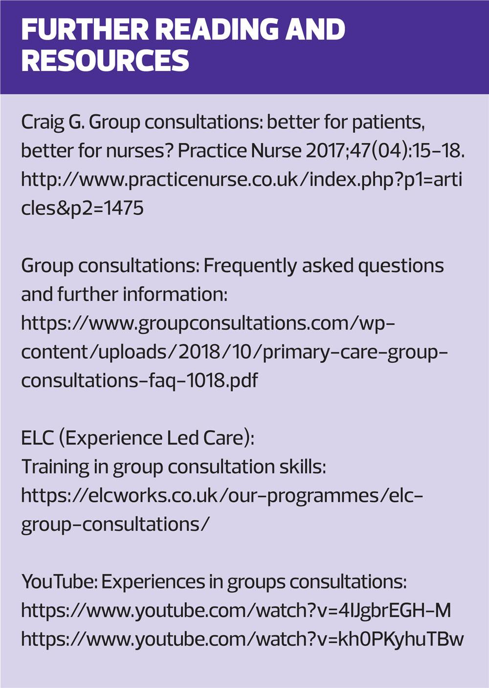 2. Birrell F, Brady L, Jones T. Group consultations, benefits and implementation strategies. Practice Nursing 2018; 29(10): https://doi.org/10.12968/pnur.2018.29.10.484