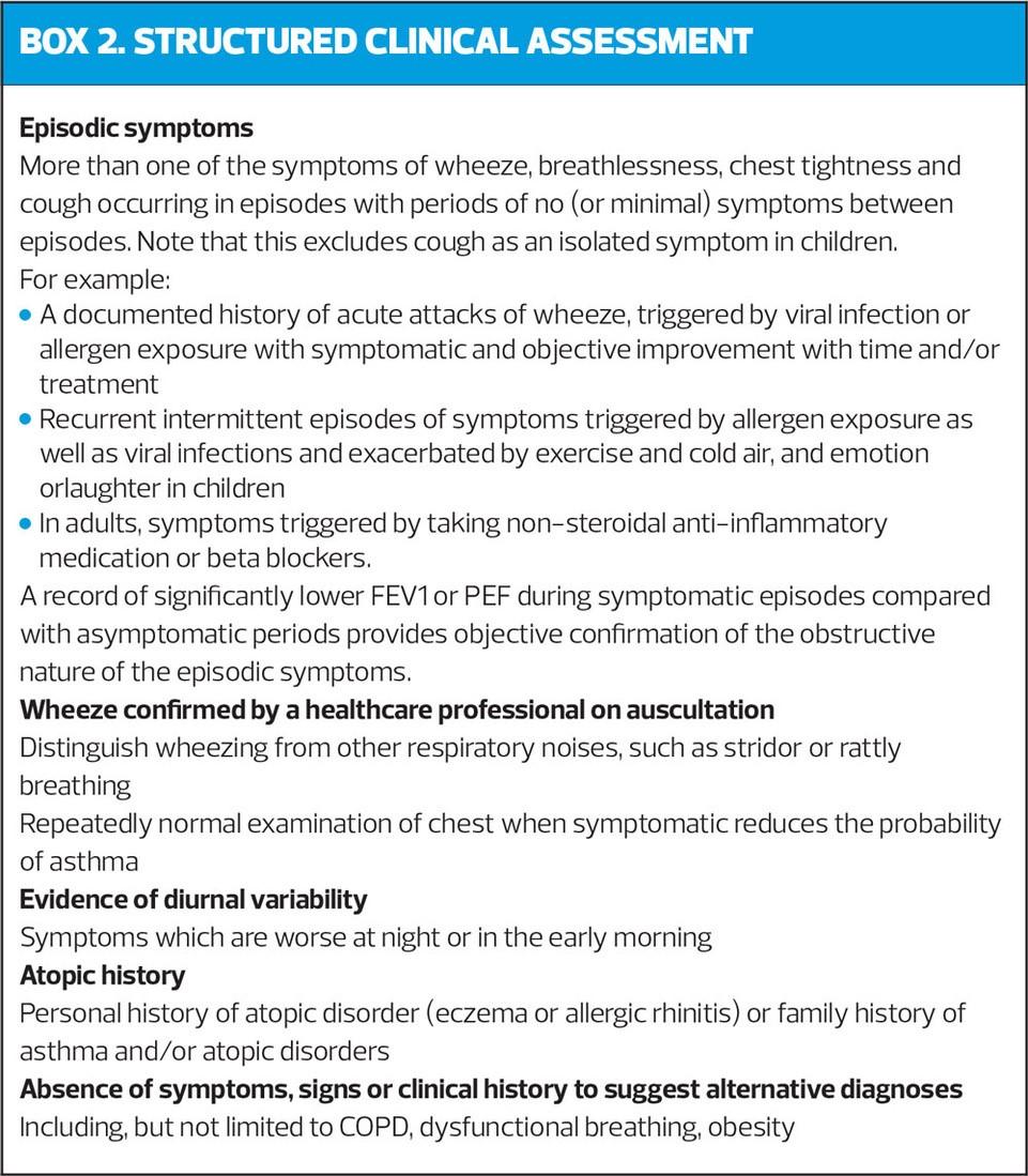 Undertake a structured clinical assessment to assess the initial probability of asthma, (Box 2) based on: