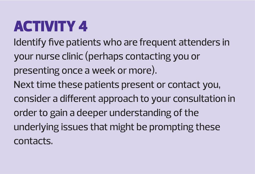Frequent attenders in general practice can benefit from more intense, meaningful conversations which gather a better overall insight into their life story and a greater understanding as to why they are presenting regularly at the surgery.22 These individuals very often have unmet needs which require further consideration. Social isolation has been associated with frequent attendance and interventions that promote social group connection have shown promise for reducing overuse of GP services.23 Social prescribing can play a big part here.
