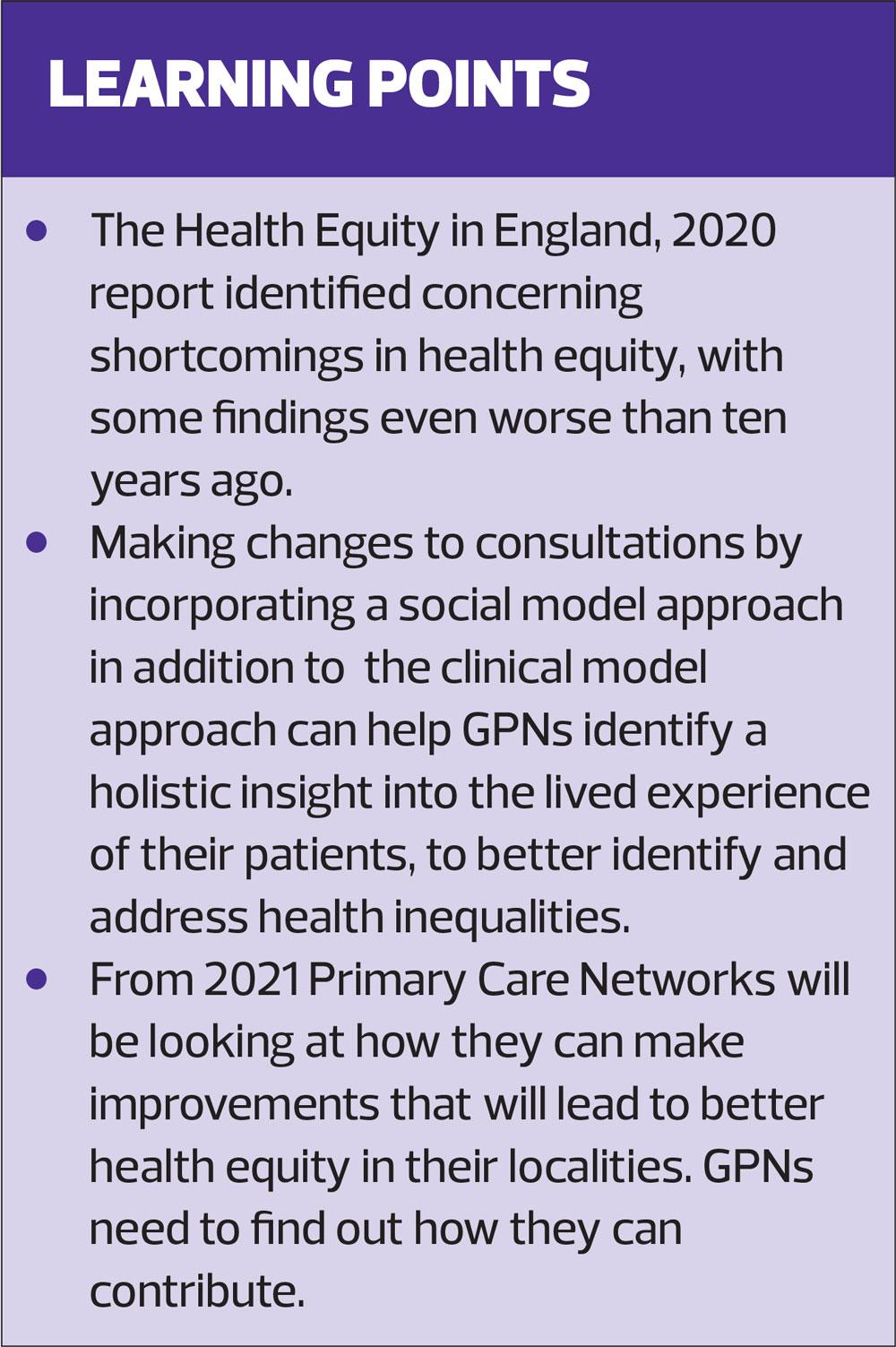 The health gap between deprived and well off parts of the country has widened, and once we get through this pandemic, can only be expected to become worse. Here we look at health inequality, explore the social determinants of health and the practical measures that GPNs can implement to make a positive impact on health equity in their local community