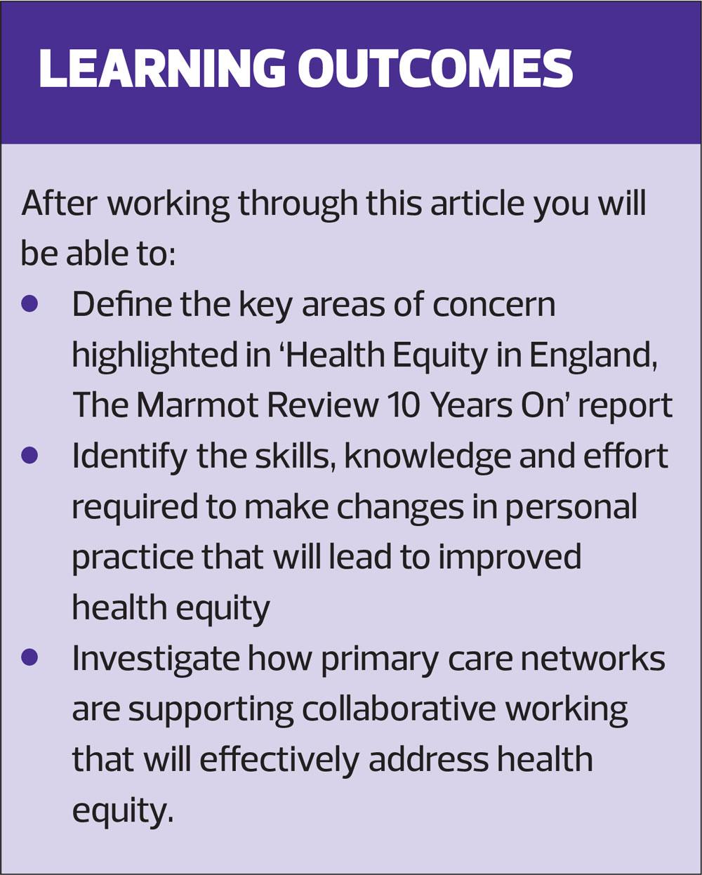 The recent Marmot report, Health Equity in England, the Marmot review 10 years on, made for uncomfortable reading and articulated an urgent imperative for us all to take action and do better at reducing inequalities in health. This article has examined the key areas of concern highlighted in the report and explored them from the perspectives of national policy, PCNs and, importantly, from the perspective of the GPN in front line general practice.