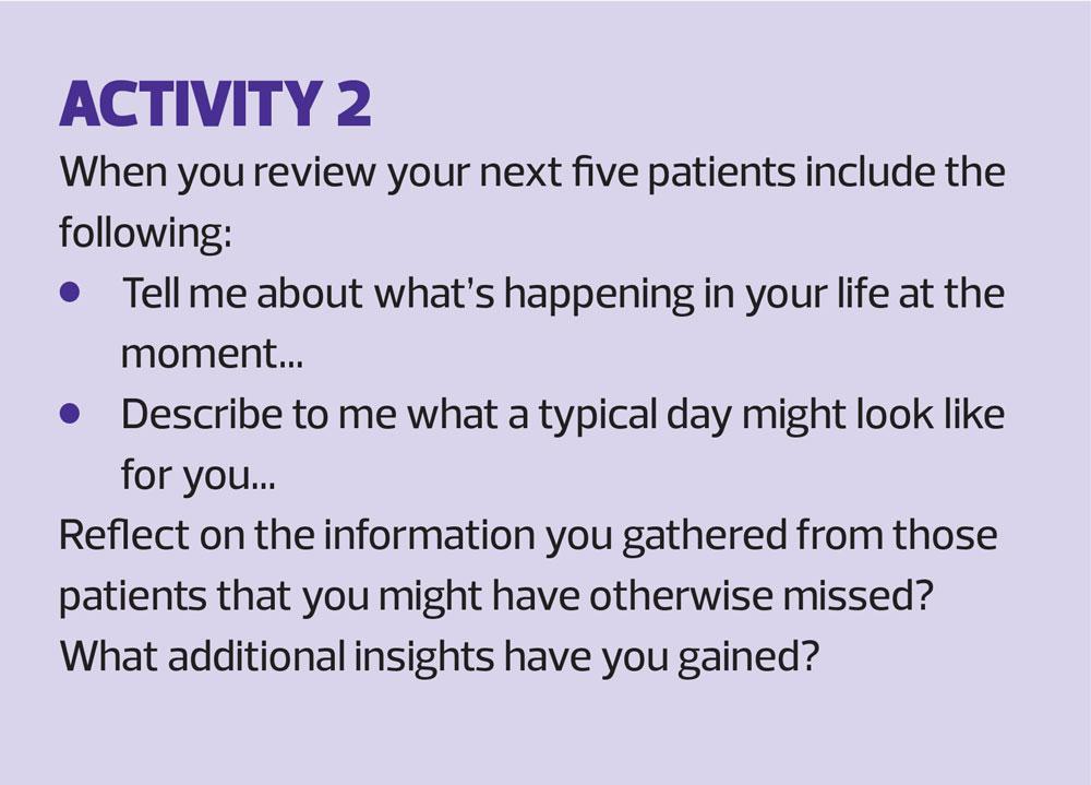 It is also extremely important to gain an understanding of our patients’ perspectives of their health and wellbeing by actively listening to their narrative.13 We are more likely to elicit conversation if we use open, rather than closed questions which tend to prompt only yes or no responses. This method of drawing out a patient’s story has been described as narrative competence. This engenders empathy, reflection, professionalism, and trustworthiness in a health professional.14 These are important strengths to enable meaningful engagement.