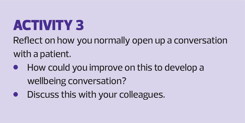 If you open a conversation by asking ‘What is going well, right now?’ that is to say, the ‘strengths’ that are working in someone’s favour, then the stance is reversed to become more positive, thereby promoting a wellbeing conversation.19