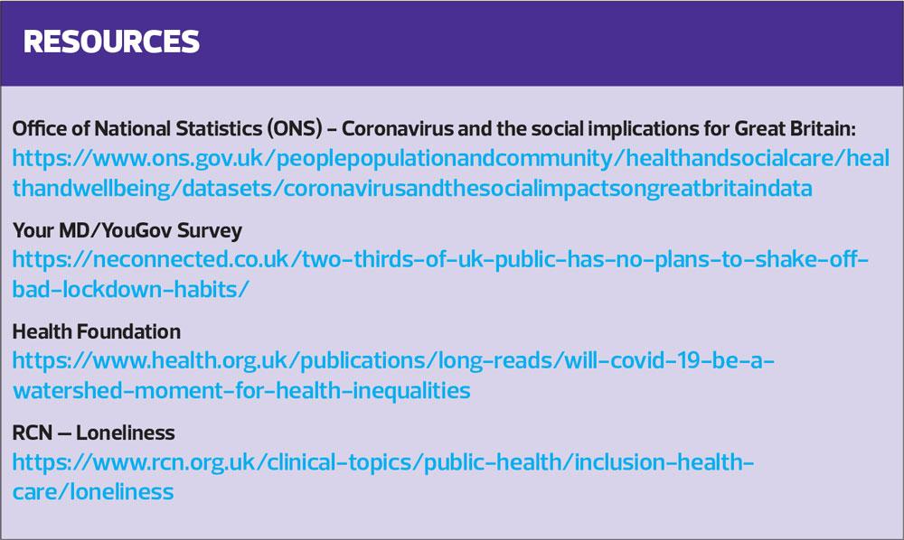 In a recent report on loneliness, the Royal College of Nursing noted that in recent decades loneliness has developed from a personal problem into a social epidemic. Anyone can be affected at any age and in any circumstance. For those in enforced isolation due to COVID-19 restrictions this will have a particular relevance. It is vital that nurses in all settings recognise loneliness and can respond accordingly with appropriate resources.11