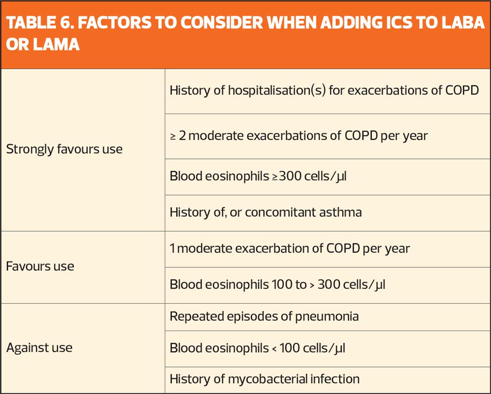 A number of studies have shown that blood eosinophil counts predict the efficacy of ICS (added to regular maintenance bronchodilator treatment) in preventing future exacerbations. No effect, or only a small effect, is seen when blood eosinophil count is <100 cells/μl, so this threshold can be used to identify patients who are unlikely to benefit from ICS, while those with a blood eosinophil count is ≥300 cells/μl are most likely to benefit (Table 6).