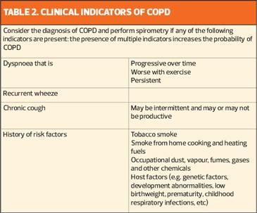 A diagnosis of COPD should be considered in any patient who has dyspnoea, chronic cough or sputum production, a history of lower respiratory tract infections and/or a history of exposure to risk factors for the disease, but GOLD says that the presence of a post-bronchodilator FEV1/FVC <0.7, confirmed on spirometry, is mandatory to establish the diagnosis of COPD. Clinical indicators of COPD are summarised in Table 2.