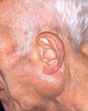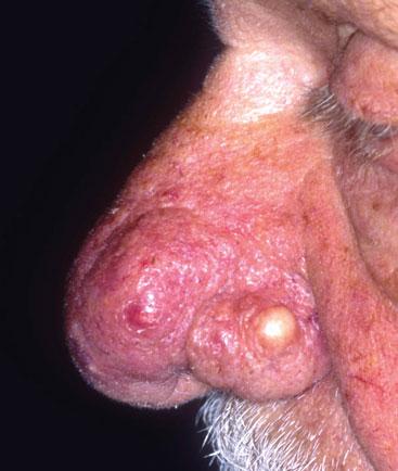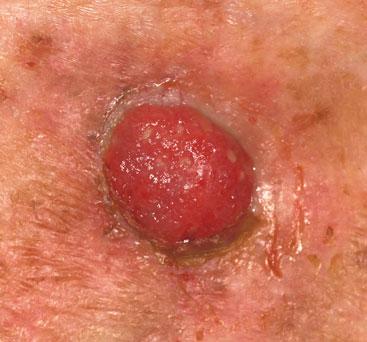 Beware the newly developed fleshy lesion on the skin of an elderly man. If it is in a sun-exposed area it is likely to be malignant in nature. In this particular case, the differential lies between a squamous cell carcinoma and an amelanotic melanoma. The diagnosis of pyogenic granuloma should not be made in an elderly person without tissue confirmation. This lesion should be removed by a dermatologist. It should be remembered that if a malignant skin lesion is identified it is important to carry out a skin survey to exclude any other malignant lesions.
